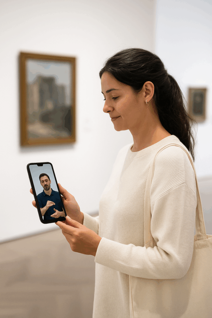 Grâce à un simple QR code, scanné avec un smartphone, l’utilisateur peut accéder instantanément à une traduction en langue des signes, réalisée par un traducteur Sourd diplômé.